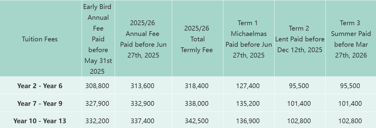 Fees paid annually before May 31st, 2025, besides the above annual payment discount, will enjoy an additional early bird discount rate which is total termly fee approximately 1.5% as shown in the Tuition Fee Table.
