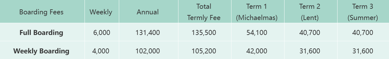 Fees paid annually will enjoy an annual payment discount rate of total termly fee approximately1.5% as shown in the Tuition Fee Table.