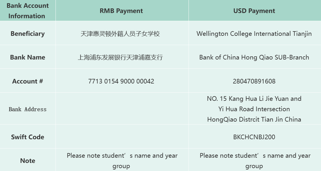 Payment can be made to the College bank account via bank transfer using RMB, US$ or cheque in RMB. Cash payments must be made in RMB. For bank transfer, please note the student's name and year group in the remark area. If payments are made in US$, conversion to RMB will be based on the exchange rate provided by the College at the time of payment.